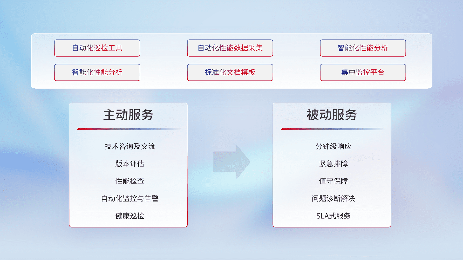 智能化工具和标准化文档,,,保障服务质量,,,,提供主动服务(包含技术咨询、、版本评估、、性能检查、、、、自动化监控与告警、、、、健康巡检)和被动服务包含(分钟级响应、、、、紧急排障、、值守保障、、、、问题诊断解决、、SLA服务)。。。